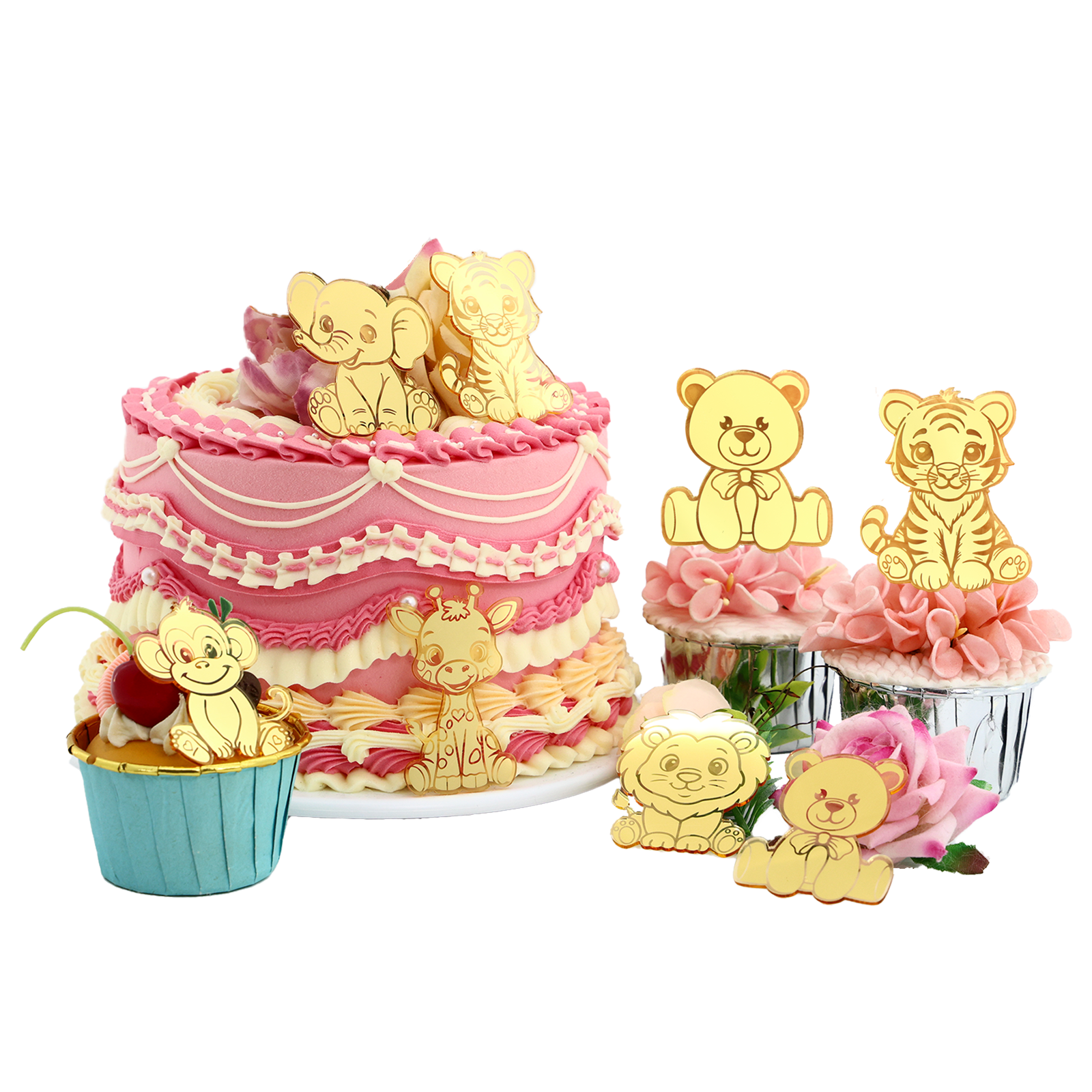 12pcs Gold Mirror Acrylic Animal Cupcake Toppers – Bear, Lion, Giraffe, Monkey, Elephant & Cheetah
